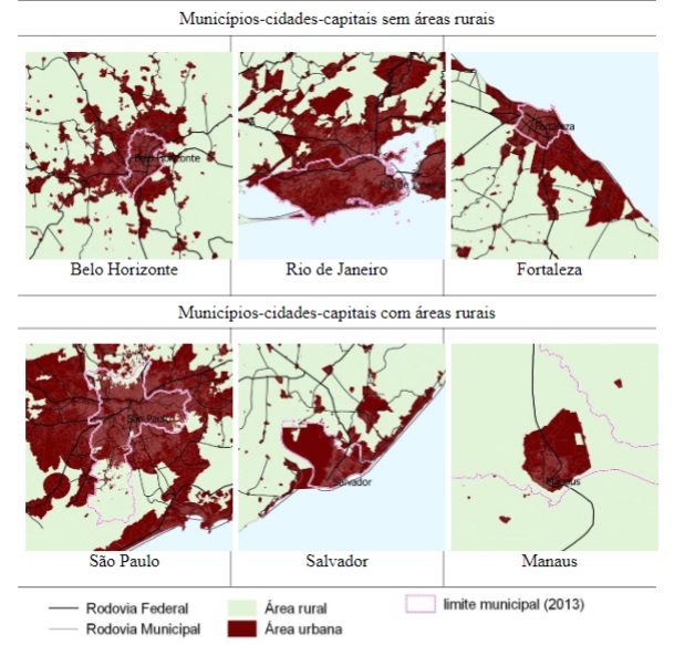 A extensão das áreas rurais existentes entre áreas urbanas, assim como, as relações entre o tamanho dos municípios, cidades e vilas, influenciam diretamente nas estratégias de planejamento e gestão públicas. A diversificação da relação entre área urbana e rural que compõe os limites municipais de algumas capitais dos estados, ainda possuem áreas rurais apesar da conurbação com outros municípios. A figura 4 ilustra, na escala metropolitana, algumas capitais do Brasil
