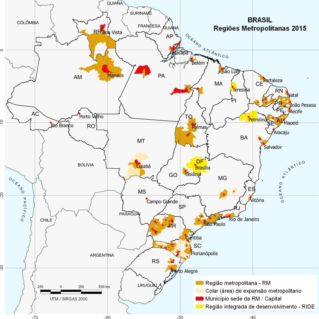 Garson (2010) distingue os conceitos de Região Metropolitana e Metrópoles, sendo estas últimas, equivalente a uma parcela das áreas urbanas aglomeradas existentes dentro de uma ou mais Regiões Metropolitanas ou RIDE institucionalizadas por leis estaduais, pode também, ser representada pelo conjunto de cidades, internas as RM, que apresentam suas áreas continuas, ou espacialmente unidas na mesma classificação “urbana” além dos limites municipais11.