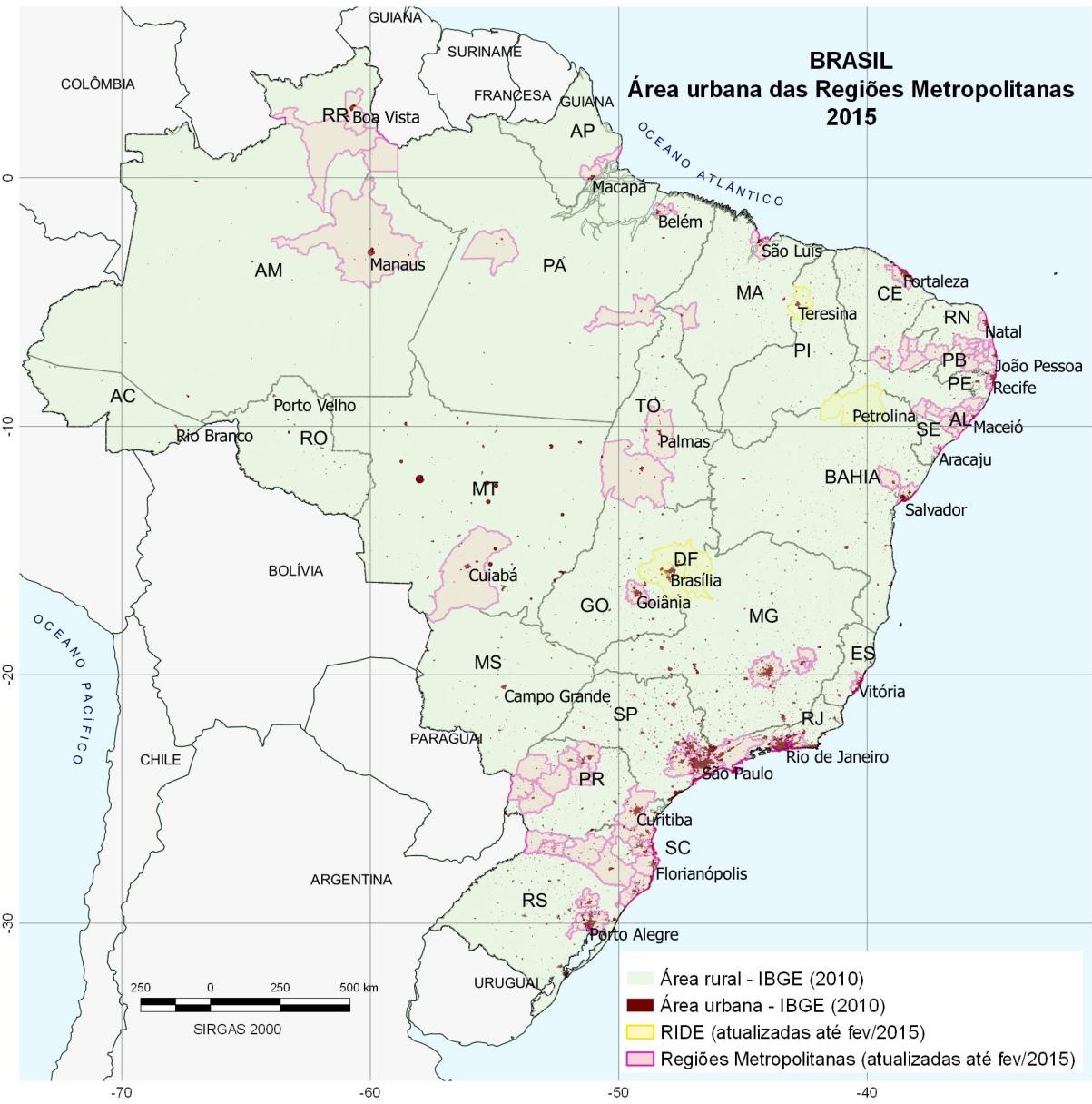 A sobreposição das RMs e Regiões Integradas de Desenvolvimento -RIDEs apresentadas na figura 5 e sua correlação com as áreas urbanas apresentada, anteriormente, expõe uma falsa realidade no estabelecimento das áreas metropolitanas. A figura 6 ilustra a ocorrência das áreas urbanas, determinadas pelos critérios do IBGE, internas aos limites das RMs e RIDEs.