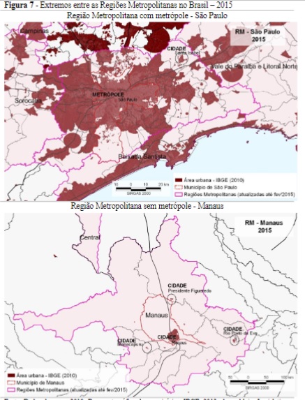 De acordo com as definições territoriais do IBGE, descritas anteriormente, nas áreas aglomeradas existentes dentro das regiões metropolitanas, ressalta-se que em alguns casos a cidade equivale a uma parcela da área urbana aglomerada interna ao limite do município. A diversidade das regiões metropolitanas existentes no Brasil, enfatizada pelos autores citados, é demonstrada neste estudo, na figura 7 que ilustra a situação de regiões metropolitanas com e sem a existência de metrópoles.