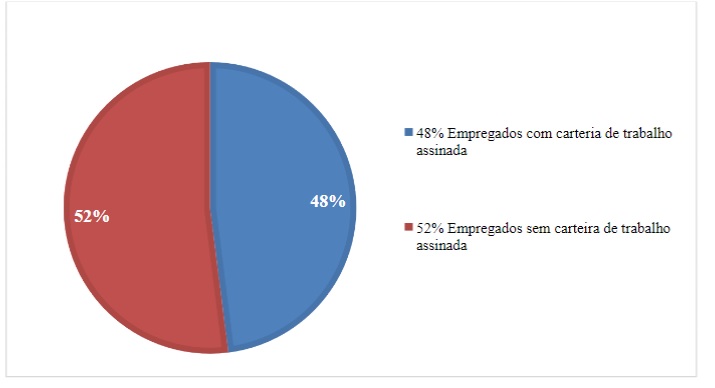 No gráfico 2, podemos perceber que o número de trabalhadores com carteira assinada tem um índice indesejável, segundo os dados do IBGE -Censo Demográfico de 2010, representando apenas 48% do total. E no que diz respeito aos trabalhadores sem carteira assinada, os números correspondem a 52% do total. Essa constatação constitui um dado desanimador, ou seja, ter menos trabalhadores com carteira assinada do que sem carteira assinada, este fato representa tendências negativas para o mercado de trabalho e para os índices de desenvolvimento humano no município.