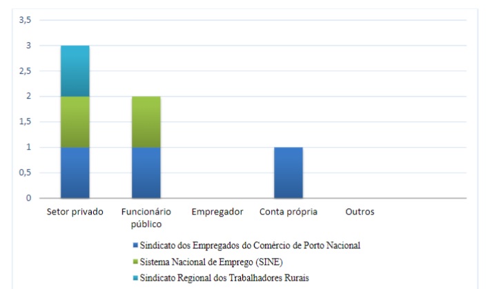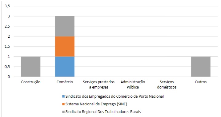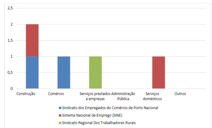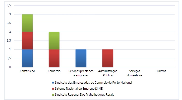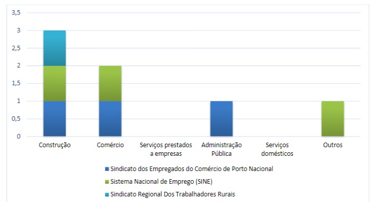 Analisando as tendências de oferta de emprego formal em Porto Nacional-TO, conforme entrevista realizada nos sindicatos do município em estudo, foi possível observar a dinâmica e desempenho do emprego formal. Segundo o Sindicato Regional dos Trabalhadores Rurais, os serviços prestados às empresas, foram uma das áreas de emprego formal que mais ofertaram postos de trabalho no período de 1995 e 2014. O Sistema Nacional de Emprego (SINE) considerou a área de construção civil e dos serviços domésticos. O Sindicato dos Empregados do Comércio também considerou as áreas de construção e comércio como sendo as áreas que produziram maior número de ofertas de empregos na cidade de Porto Nacional no período de 1995 a 2014, como descrito no gráfico nº 3.