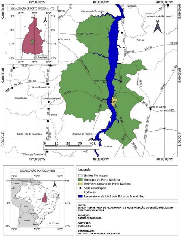 O município de Porto Nacional é um dos mais antigos do Tocantins. Sua origem histórica vem desde o século XVIII. Segundo Oliveira (2009), o povoado de Porto Nacional teve sua origem por volta da última década do século XVIII e início do século XIX, com a formação de um pequeno povoado conhecido por Arraial Novo do Porto Real do Pontal. Por volta de 1810, já teria se constituído em um centro regional na região. O arraial de Porto Real era circundado por outros arraiais auríferos importantes despertando ao Poder Real, grande interesse pela riqueza mineral (ouro) da região. Apesar de Porto Real (Porto Nacional) não ter ouro, era local de embarque e desembarque de garimpeiros, para localidades estratégicas às margens do rio Tocantins. O transporte da produção mineral era realizado pelo rio Tocantins até Belém-PA. Atualmente, o município de Porto Nacional fica na Mesorregião Oriental e na Microrregião de Porto Nacional do Tocantins, a 52 km da capital Palmas e, compreende uma área de aproximadamente 4.449,918 km² distribuída em uma população aproximada de 52.828 habitantes (IBGE, 2017). O mapa 01, abaixo, demonstra a localização geográfica de Porto Nacional.