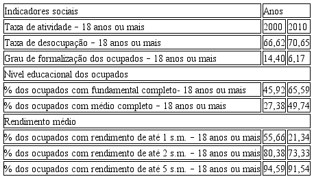 Entre 2000 e 2010, a taxa de atividade da população de 18 anos ou mais (ou seja, o percentual dessa população que era economicamente ativa) passou de 66,62% em 2000 para 70,65% em 2010. Ao mesmo tempo, sua taxa de desocupação (ou seja, o percentual da população economicamente ativa que estava desocupada) passou de 14,40% em 2000 para 6,17% em 2010. Quanto ao grau de formalização dos ocupados de 18 anos ou mais, houve uma pequena evolução e, com relação ao nível educacional dos ocupados também houve uma evolução, principalmente do percentual dos ocupados com ensino médio completo com 18 anos ou mais, o que é desejável.