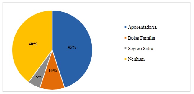 Os dados demonstraram que a renda monetária dos residentes, em sua maioria, é inferior a um salário mínimo, convergindo com estudos de Silva; Cândido e Freire (2009), Lucena e Freire (2014; 2015), Guedes e Amaral (2015), e Pereira Neto; Peixoto e Araújo (2017), pesquisando famílias residentes no entorno de reservas hídricas. Foi ainda declarado que essa se dá a partir de auxílios sociais do governo, no qual 45% dos benefícios possuem aposentadoria, 10% do Programa Bolsa Família e 5% do Seguro Safra. 40% declararam não possuir benefício social, pois a renda é advinda da agricultura e pecuária desenvolvida no entorno do reservatório. Logo, pode-se observar que a renda de 60% pesquisados, é menor que um salário mínimo e está interligada a programas governamentais de transferência de renda(Gráfico 1).