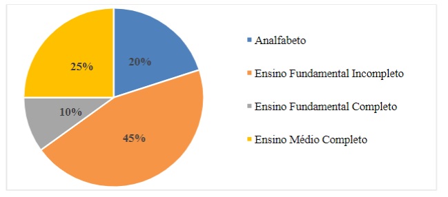 O nível de escolaridade das famílias (Gráfico 2) demonstra que 45% dos entrevistados possui ensino fundamental incompleto, 25% ensino médio completo, 20% são analfabetos e 10% com ensino fundamental,o que evidencia a baixa escolaridade das famílias, corroborando com os dados educacionais do município de Rodolfo Fernandes, em que 58% da população acima de 10 anos, segundo o Censo (IBGE, 2010) não são alfabetizados ou têm o fundamental incompleto. Dados semelhantes observa-se nos estudos de Suess; Bezerra e Carvalho Filho (2013); Guedes e Amaral (2015); Pereira Neto; Peixoto e Araújo, (2017).