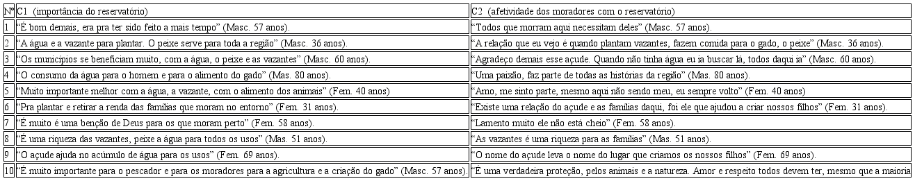Os questionários foram aplicados aos residentes (N:20) do entorno do reservatório. Cabe destacar, que o reservatório está localizado na zona rural, e as residências próximas a esse possue um númeiro pequeno, sendo observado a necessidade de aplicar a todos.Sendo adotado como critério de seleção ser membro familiar com idade mínima de 18 anos. As categorias da análise do discurso dos residentes foram as seguintes: a) relevância econômica do reservatório (C1); b) afetividade com o reservatório (C2).