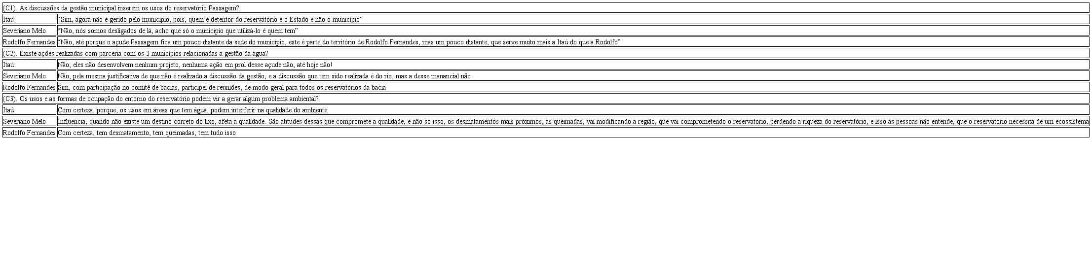 As entrevistas são fontes relevantes para a produção dos dados, pois agrega aos conceitos científicos as vivências e falas dos indivíduos entrevistados. As entrevistas no total de 3 (N = 3) foram realizadas no mês de abril do ano de 2017 com os secretários de meio ambiente das prefeituras dos municípios de Itaú, Rodolfo Fernandes e Severiano Melo. Os roteiros foram compostos por perguntas abertas, relacionadas à gestão de recursos hídricos, em particular sobre o reservatório Passagem. As categorias da análise do discurso dos secretários foram as seguintes: a) as discussões da gestão municipais (C1); as ações realizadas em parcerias com os municípios relacionados a gestão da água (C2); e se, os usos e as formas de ocupação do entorno do reservatório pode vim a gerar algum problema ambiental (C3).