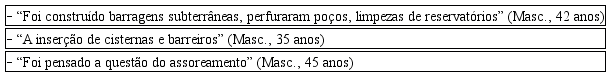 “A falta de inverno, a falta do açude encher” (Fem., 58 anos).“A seca, acabou todo a ração. Já há 6 anos que não tem um inverno bom” (Masc., 36 anos).“A mudança das chuvas, que não são suficientes para segurar a lavoura” (Fem., 40 anos).“Antes eram invernos bons, agora a seca e a falta d’água matando tudo” (Masc., 50 anos).“No lugar dessa mata cheia de jurema, existia uma riqueza em algodão” (Fem., 75 anos).“O cultivo do algodão que acabou, e não existe mais” (Fem., 57 anos)(informação verbal)5.