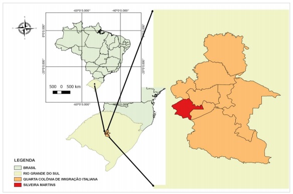 A Quarta Colônia de Imigração Italiana do Rio Grande do Sul (antiga Colônia Silveira Martins), apresentada no Mapa da Figura 1, localizada na região centro-oeste do Estado, entre Santa Maria e Cachoeira do Sul, foi fundada em 19 de maio de 1877 com a vinda de imigrantes italianos oriundos das regiões do norte da Itália. Esse processo migratório se associa ao processo de ocupação das terras sulinas4 no século XIX, proposto pelo Governo Imperial Brasileiro, assim como, pela necessidade da Itália em “expulsar” para outros territórios a população expropriada do meio rural e os desempregados citadinos criados pela crise agrícola e urbana (MANFIO; BENADUCE, 2017)