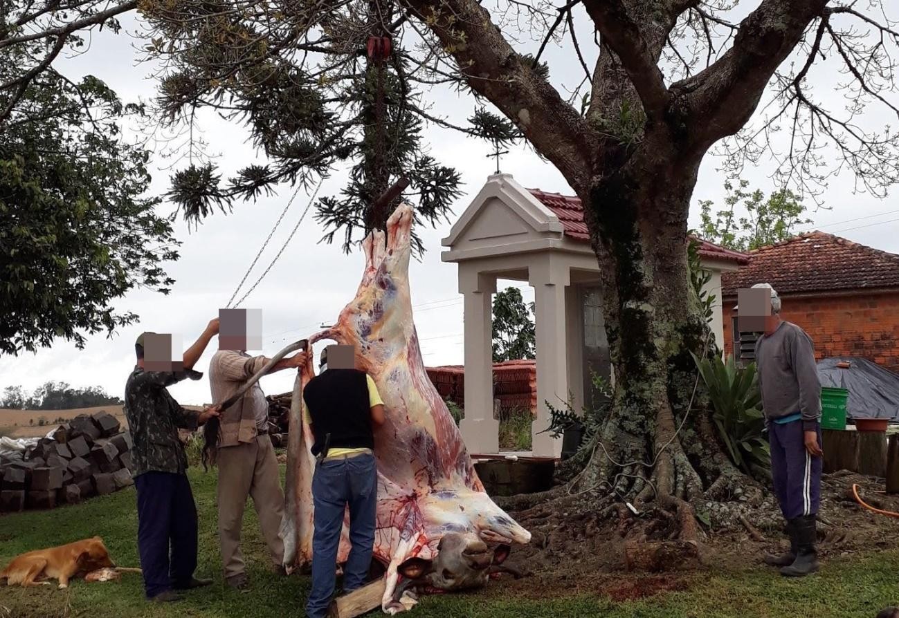As narrativas que tecem a história apresentada na imagem da fotografia 4, revelam que “[...] o animal se enforcou ao tentar passar a cerca”, observam que é um acontecimento tido como “natural”, algo corriqueiro, mas deixam claro que o sangramento deve ser feito, logo, até uma hora após a morte, para não comprometer a carne,“[...] aprendi com o meu avô [...]” (informação verbal)8 . Na cena vários conhecimentos herdados foram exercitados desde o chamar os vizinhos para realizar a carneação, o lugar preciso do corte para a sangria, saber pendurar o animal na árvore, além de toda a desossa e corte da carne em pedaços para fritar, assar ou dar como alimento aos animais.