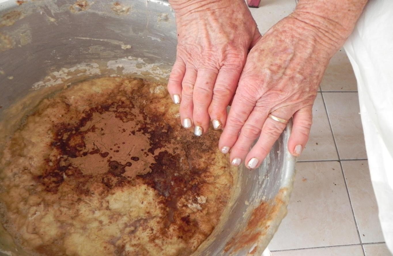 A pele envelhecida e a deformação dos dedos devido à artrite reumatoide mostram que o tempo agiu sobre o corpo humano. Mas, não sobre a memória do saberfazer tradicional do descendente do imigrante italiano, ruralidade que permanece viva nas práticas diárias da depoente C , que diz ser uma das poucas pessoas que ainda reproduz a receita com o fermento de batata no espaço rural de Silveira Martins. Além de observar que as famílias da agricultura familiar, na atualidade, compram pães e cucas dos “mercados ambulantes12”. Cabe lembrar que a transmissão do conhecimento ocorre por meio de um ato linguístico, onde um comunica e o outro recebe o comunicado. Entretanto, no contexto descrito pela depoente, no diálogo, hoje, no meio rural, geralmente falta uma das pessoas na interação comunicativa, ou se tem, não prática o comunicado, assim o mesmo cai no esquecimento e, por fim, acaba desaparecendo ou sendo substituído por “ruralidades contemporâneas”.