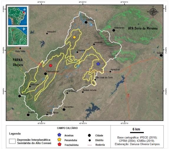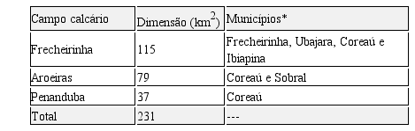 No contexto regional do geossistema da Depressão Interplanáltica Semiárida do Alto Coreaú (DISAC) registra-se a ocorrência de três campos calcários perfazendo uma área total de 231 km2 (quadro 1) historicamente explorados e beneficiados para a produção artesanal da cal e industrial do cimento abrangendo áreas dos municípios de Coreaú, Frecheirinha, Sobral, Ubajara e Ibiapina, por ordem de extensão.