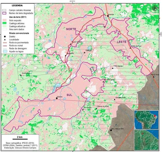 Em estudo realizado por Albuquerque (2015) no geossistema da Depressão Interplanáltica Semiárida do Alto Coreaú (DISAC), região noroeste do Estado do Ceará entre o maciço residual da Meruoca e o planalto da Ibiapaba, constatou-se que os maiores índices de degradação ambiental estão na porção leste, área mais seca e de abrangência do campo calcário Aroeiras guardando grande relação com a área identificada por Funceme (1992) e CGEE (2016).