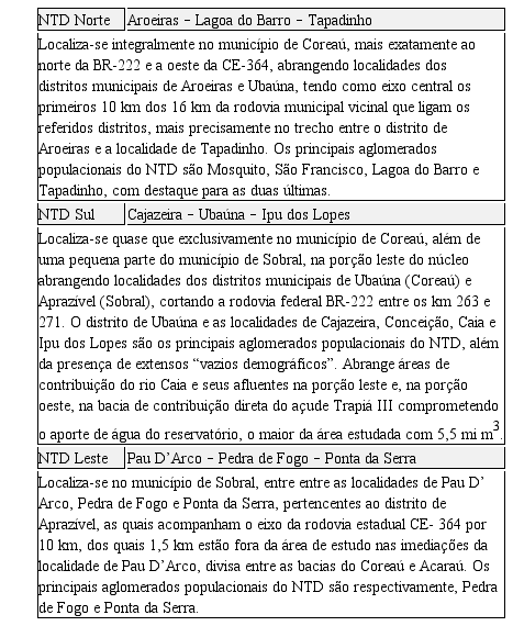 As áreas com maior grau de conservação das terras, por sua vez, estão no interior do campo Aroeiras, formando faixas de transição entre os NTD Norte, Sul e Leste, as quais podem ser identificadas por duas áreas espacialmente representativas: a área de entorno da jazida da fábrica de cimento do grupo Votorantim, no distrito de Aprazível e a área de um plano de manejo florestal entre as localidades de Campo de Dentro e Queimadas (painel 3), respectivamente, nas extremidades leste (município de Sobral) e oeste (município de Coreaú) do campo Aroeiras.