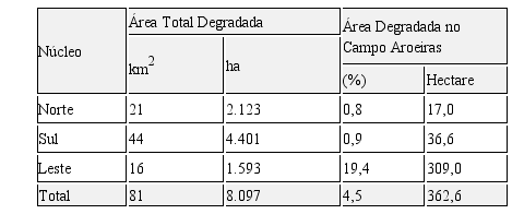 Na escala do campo Aroeiras e entorno, uma das fáceis do geossistema foram identificados três núcleos de terras degradadas (NTD), áreas com elevado grau de degradação e significativa representação espacial, as quais foram denominadas de NTD Norte, Sul e Leste (Qudro 2).
