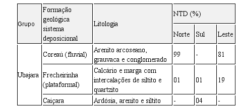 Em função da pequena área degradada na parte interna ao campo Aroeiras (formação Frecheirinha), partimos para a correlação espacial das áreas degradadas com as demais formações geológicas do grupo Ubajara, onde foi possível constatar que as terras degradadas estão principalmente nas formações Coreaú e Trapiá, respectivamente e, em menor grau, nas Formações: Caiçara e Frecheirinha, esta última de ocorrência dos calcários (Quadro 4).