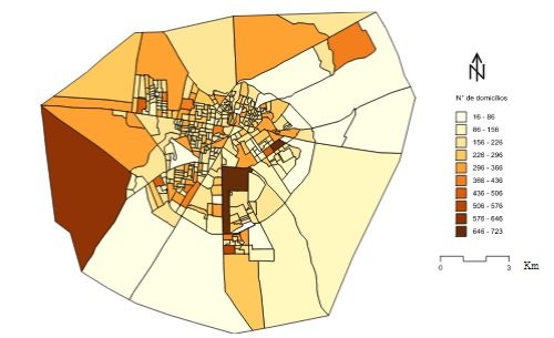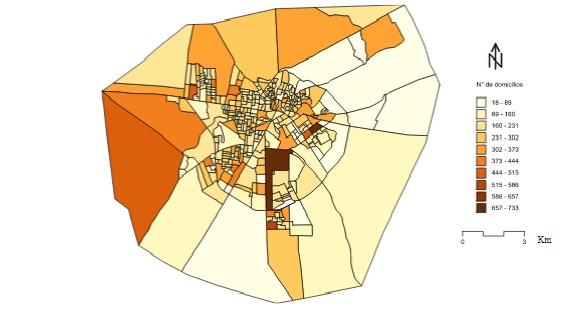 O mapa 1 mostra a distribuição de setores censitários por bairros de Vitória da Conquista e deve servir como referência para a leitura das outras; o Mapa 2 mostra a distribuição espacial, por setores censitários2, dos domicílios com renda total até 3 salários mínimos na cidade de Vitória da Conquista, incluindo também aqueles sem rendimento. A observação dessa figura leva a conclusão de que há uma significativa distribuição dessa faixa de renda concentrando-se menos nos setores censitários no sudeste da cidade, equivalente aos bairros Recreio e Candeias os quais, tradicionalmente, foram ocupados pela classe média e parte da elite conquistense.