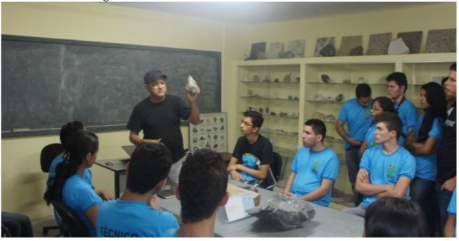 During the visit to the Museum of Minerals and Rocks, there was the recognition of mineral, rocks and fossils, creating the opportunity of first contact to the region elements to identify the importance and applicability in daily life, as well as their relationships in the soil formation, and encouraging the visitors to elaborate questions to contribute to the learning process as shown below in photo 1.