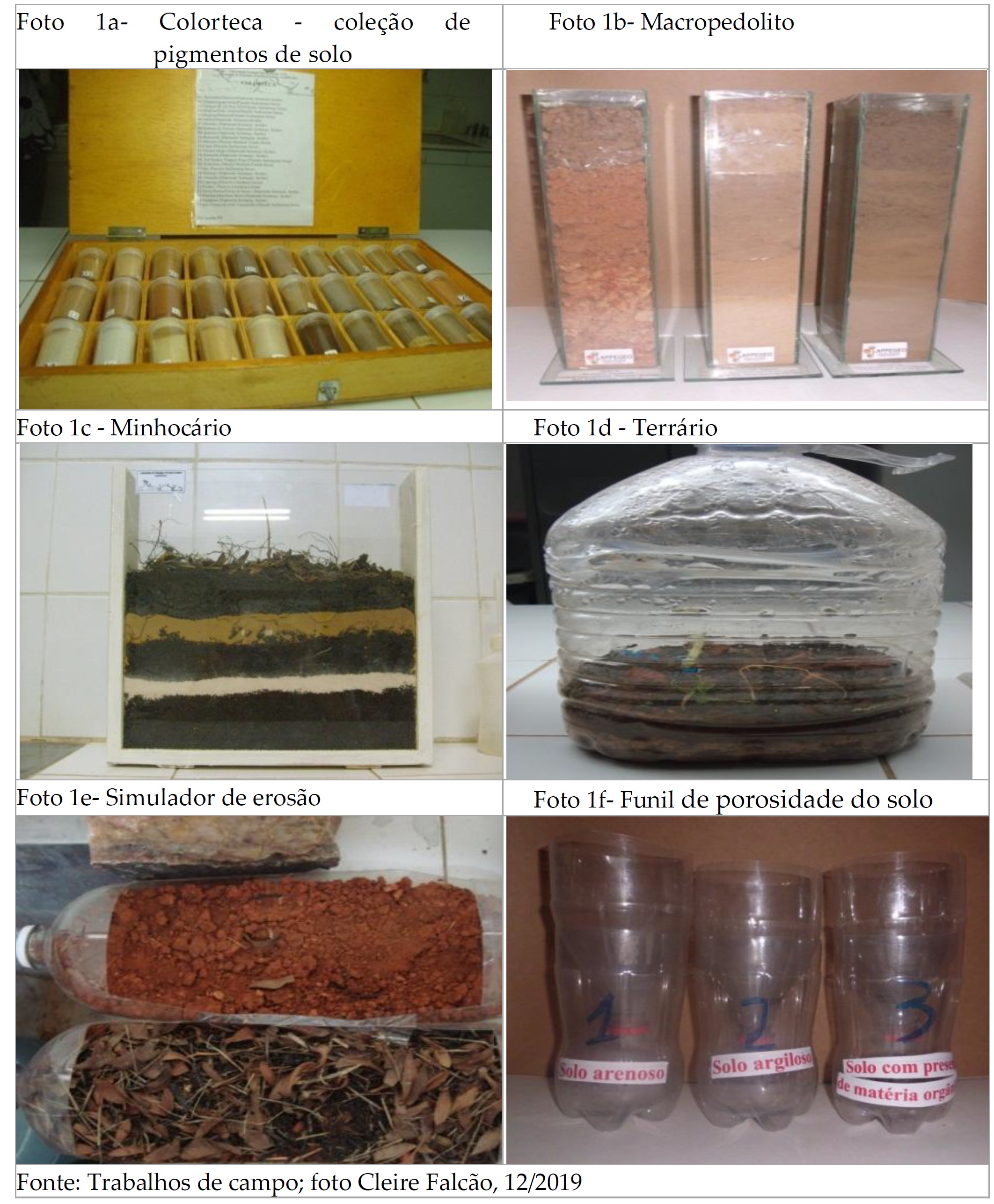 About the macropedoliths (panel 1, photo 1b), they conceive a soil profile, in the laboratory or classroom. They are had as a meaningful educational resource that assists in the comprehension of the soil profile, mainly when there is not fieldwork, what is more, macropedoliths are easily set up and satisfactorily interpreted, what facilitates the visualization of soil and the comprehension of its characteristics. This way, the goal is to analyze the characteristics of different soils in the region through a tool that represents this profile.