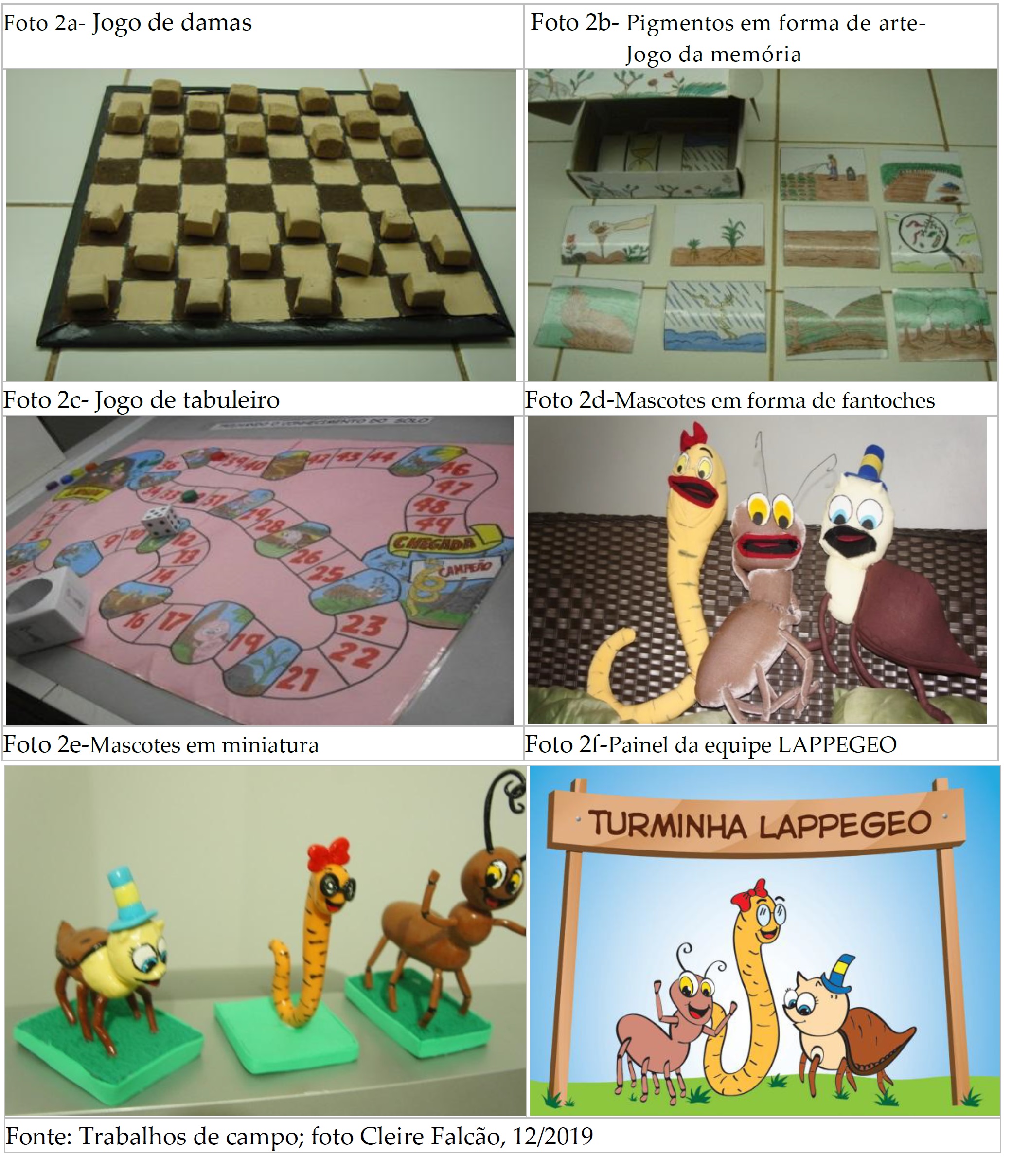 The board game (photo 2c)named “treading the soil knowledge” is quite a pathway that students need to tread. It contains forty-nine questions about the soil as for its origin, formation, among others, and such topics, addressed in textbooks, become more dynamic and differentiated since students come to be active agents in the learning process.