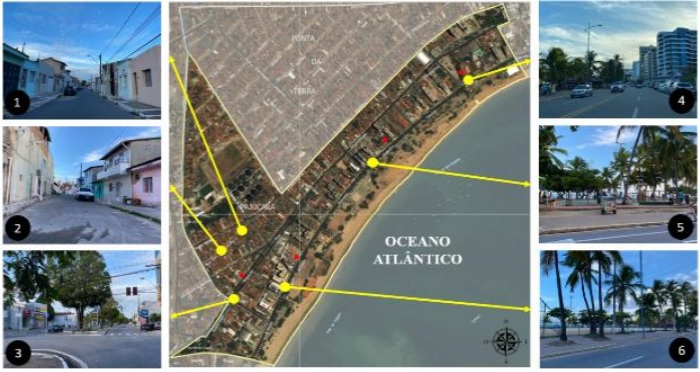As imagens 1 e 2 mostram o padrão de ocupação do solo nas quadras localizadas na região interna do bairro, com ruas e calçadas estreitas e sem árvores e residências sem recuos frontais e laterais, ocupando todo o perímetro da quadra. A imagem 3 mostra um canteiro central localizado nas quadras próximas à orla. As imagens 4, 5 e 6 mostram a avenida litorânea com quatro faixas de rolamento, ladeada por calçadas largas e predominantemente vegetadas com coqueiros, constituindo a paisagem típica do cartão-postal turístico do bairro.