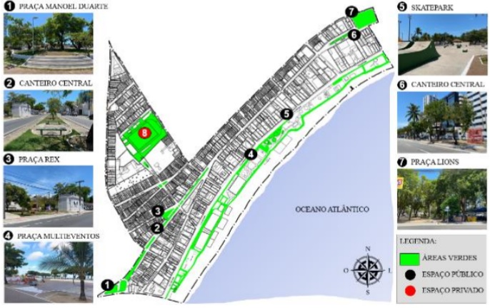 O bairro possui importantes espaços públicos com presença de vegetação em praças, canteiros centrais, terrenos particulares e na orla marítima. A maior concentração de vegetação encontra-se na faixa da orla, como se pode verificar pelos espaços verdes do Infográfico 1. No entanto, nos canteiros e nas praças também se podem observar vegetações gramíneas, arbustivas e arbóreas de diferentes espécies e tamanhos, como nas Praças Manoel Duarte, Praça Rex, Praça Multieventos e Praça Lions.