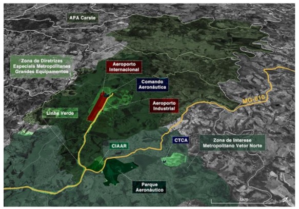 Em meados de 2015, quando foi elaborado o Macrozoneamento da Região Metropolitana de Belo Horizonte, um dos pontos de interesse da formação de novas centralidades foi o aeroporto. E um aeroporto enquanto núcleo central de vetor de crescimento é uma prerrogativa defendida por Kasarda (2006), o precursor do termo Aerotrópolis. Assim, no Macrozoneamento da RMBH, na Zona de Interesse Metropolitano (ZIM) alguns dos principais marcos são a Linha Verde (MG-010) e o único Aeroporto Internacional de Minas Gerais, o Aeroporto Tancredo Neves em Confins. Além disso, envolveria o Centro de Treinamento e Controle da Aeronáutica (CTCA) e a Base Aérea ambos em Lagoa Santa. Assim, essa zona ficou caracterizada como uma Zona de Diretrizes Especiais Metropolitanas de Grandes Equipamentos (FREITAS, 2017). (mapa 2)