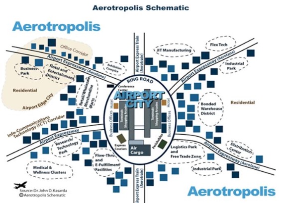 A aerotropolis, como o próprio nome diz, é uma cidade que tem o aeroporto como principal centralidade. Em tal modelo de planejamento urbano, bastante ligado ao neoliberalismo, o desenvolvimento irradia deste núcleo multimodal, que seria o aeroporto, com largas rodovias e vias arteriais e diferentes colares de desenvolvimento, permeados por áreas verdes (mapa3).
