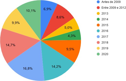 No ano de 2015, mais especificamente em 24 de janeiro, uma matéria alega que os blocos de carnaval da área ainda “mantêm clima romântico dos antigos carnavais”23 e que isso se configura como um fator de atração de novos foliões. Já nas primeiras frases do texto, nos deparamos com o seguinte conteúdo: “A Zona Portuária atrai a cada ano mais gente interessada em pular tranquilamente o carnaval. Com uma diversidade de blocos, a região tem chamado a atenção pela folia romântica e ainda inocente da festa de Momo.” Seguindo com essa proposta, a redação afirma que “muitos foliões já foram seduzidos pela folia desse canto da cidade.” Para embasar tal afirmação, o jornal expõe uma entrevista com um morador do Humaitá, bairro nobre da cidade, que afirma gostar “de curtir a folia na Zona Portuária”, pois, segundo ele, há muita história no local. Na mesma reportagem, a presidenta da Liga Portuária ressalta que a ideia é “fazer do Largo da Prainha o melhor e maior ponto de carnaval do Rio.” Segundo os dados de nossas entrevistas, o percentual de pessoas e o ano que frequentaram o Carnaval na área pela primeira vez foi o seguinte: