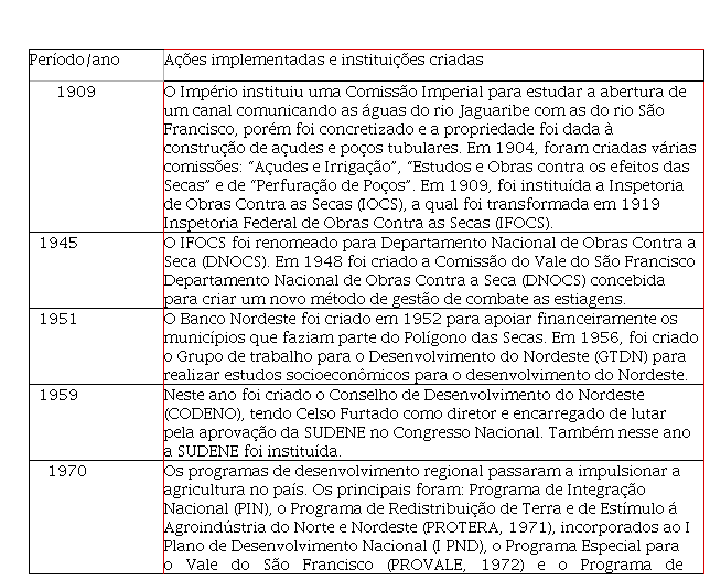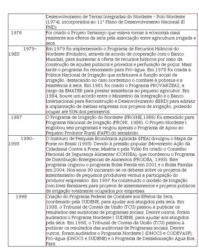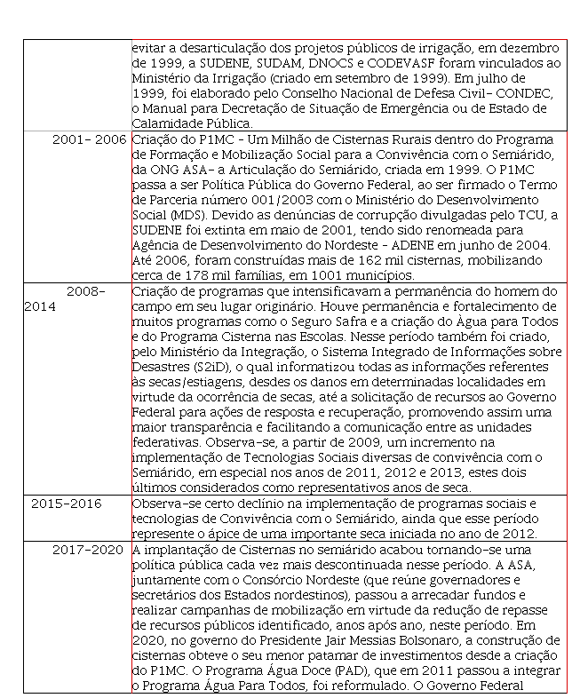 No intuito de melhor apresentar os principais mecanismos, medidas e momentos distintos aqui considerados, as principais ações foram sintetizadas, tabuladas e elencadas na tabela abaixo (Quadro 1). Apesar do esforço em se realizar uma prospecção das ações desenvolvidas em anos mais recentes, observou-se certa dificuldade em acessar informações relacionadas à adoção de políticas públicas voltadas à atenuação dos efeitos das secas.