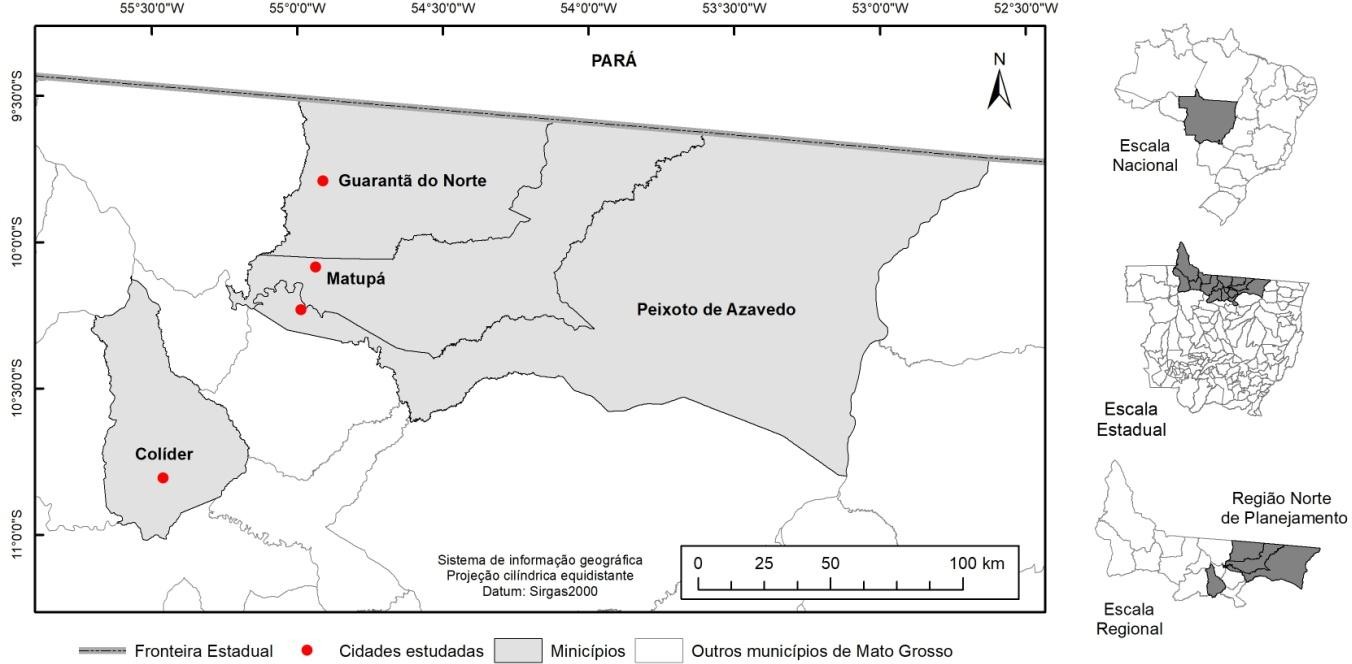 A área de estudo corresponde ao perímetro urbano das cidades de Colíder, Guarantã do Norte, Matupá e Peixoto de Azevedo, sedes dos municípios homônimos (Mapa 1), que fazem parte da Região de Planejamento II-Norte - Alta Floresta (MATO GROSSO, 2017), situada no setor meridional da bacia amazônica.