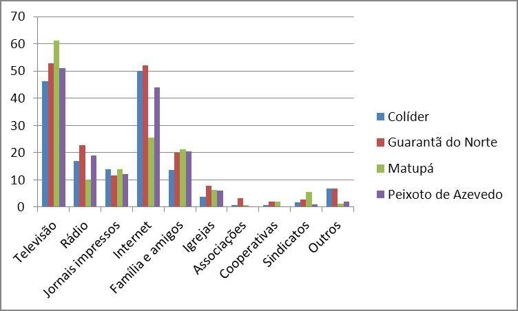Considerando que os meios de comunicação fazem a transposição da representação científica das mudanças climáticas para a cultura comum (JODELET, 1986) foi perguntado às pessoas quais meios de comunicação elas têm utilizado para obter informações em relação ao tema. As respostas indicam que o principal fator responsável pela homogeneidade da percepção encontrada nesta pesquisa é a televisão (canal de informação mais importante no Brasil, OLIVEIRA; NUNES, 2007), sendo que a internet foi apontada, também, nas cidades de Colíder, Guarantã do Norte e Peixoto de Azevedo principalmente (Gráfico 2).