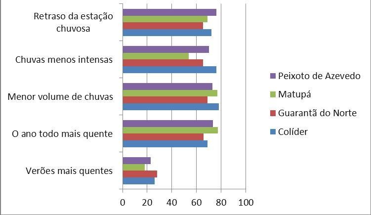 Quando perguntadas se perceberam alguma alteração do clima da região durante as últimas décadas, a grande maioria das pessoas amostradas respondeu afirmativamente: 86,0% em Colíder; 85,3% em Guarantã do Norte; 93,3% em Matupá e 83,3% em Peixoto de Azevedo.