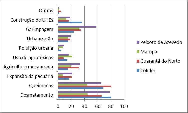 Em relação à questão seguinte: As transformações humanas da natureza podem ocasionar mudanças climáticas? Mais uma vez a grande maioria das pessoas respondeu afirmativamente: 88,9% em Colíder; 90,3% em Guarantã do Norte; 83,8% em Matupá e 89,0% em Peixoto de Azevedo. Quando questionados sobre quais atividades humanas estão contribuindo para a ocorrência de tais mudanças na região colocaram o desmatamento e as queimadas nos primeiros lugares, seguidos pela agricultura mecanizada (expressiva no município de Matupá) e a mineração do ouro (garimpagem), ainda notável em Peixoto de Azevedo (Gráfico 4). Note-se que a construção de Usinas Hidrelétricas (UHEs) é mais percebida em Colíder, onde recentemente foi construída uma UHE no rio Teles Pires.
