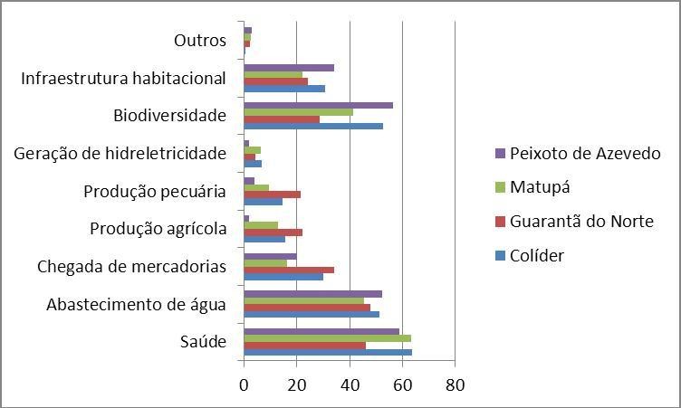 Outra questão buscava identificar a percepção sobre os setores e atividades que poderiam resultar mais afetados pelas mudanças climáticas. Nas respostas (Gráfico 5) evidenciam-se preocupações com impactos negativos na saúde humana e no abastecimento de água potável (efeito das alterações climáticas percebidas) bem como na biodiversidade da região (efeito de atividades vivenciadas, como desmatamento, queimadas e expansão da agropecuária).