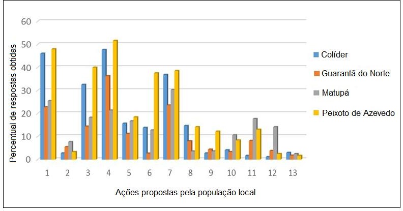 Legenda: 1-Reflorestar; 2-Criar APPs; 3-Criar consciência ecológica; 4-Deter o desmatamento; 5- Recuperar rios e nascentes; 6- Reduzir a poluição; 7- Evitar as queimadas; 8- Não construir UHEs; 9- Realizar mudanças no manejo pecuário; 10- Correção de solos; 11- Mudar costumes e cultura em geral; 12- Diminuir a agressividade ecológica; 13- Tarde demais.