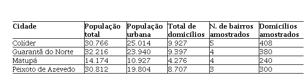 Portanto, a escolha da amostra foi intencional para incluir aos responsáveis pela administração das residências considerando, também, a sua idade (cada participante preencheu um Termo de Consentimento Livre e Esclarecido para o uso dos seus dados pessoais e respostas). Paralelamente, os bairros foram selecionados aleatoriamente em cada cidade. A Tabela 1 mostra dados demográficos das cidades estudadas, bem como o número de bairros e de domicílios amostrados em cada uma.