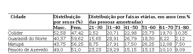 O universo da pesquisa esteve composto pelos responsáveis de domicílios das cidades supracitadas, as que foram selecionadas tendo em vista que elas são sedes de municípios onde se desenvolvem as principais atividades econômicas da região: agricultura, pecuária e extrativismo vegetal e mineral (garimpagem). Os critérios de seleção da amostra foram os seguintes: (1) que estejam representados, pelo menos, 10% dos bairros de cada cidade estudada; (2) que a pessoa amostrada seja um dos responsáveis do domicílio; (3) que esse responsável de domicilio tenha idade entre 21 e 80 anos (razão pela qual podem ser considerados sujeitos maduros, de acordo com PEDRINI et. al., 2016).