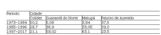 Paralelamente, a Tabela 3 mostra que muitas pessoas chegaram aos municipios de Guarantã do Norte e Matupá entre 1997 e 2017, o que pode ser explicado pela rápida expansão das atividades econômicas neles durante esse período.