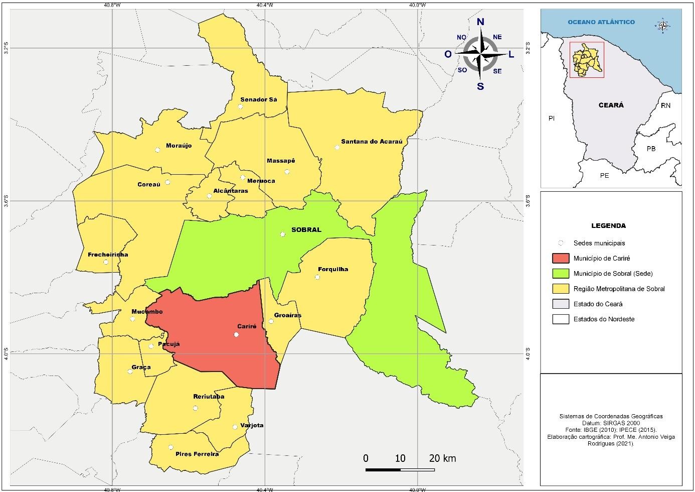 Para a construação do presente texto, utilizamos como procedimentos metodológicos, revisão bibliográfica sobre os principais temas a questão metropolitana brasileira consultando autores como Lencione (2006) e Firkowski (2013), dentre outros; sobre a RM de Sobral, tendo amparado nas legislações estaduais e no estudo de Rodrigues (2020); e análise crítica a partir da leituira do documento PDUI/RMS (2018), no que se refere à reestruturação territorial do município de Cariré, sob uma perspectiva da ciência geográfica. Como aporte às análises, foram realizadas, ainda, consultas em sítios eletrônicos e documentos oficiais do IBGE (2018; 2020) e do IPECE (2015), além de trabalhos de campo no município.