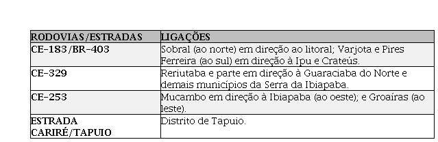 Estas são as ligações de rodovias asfaltadas, mas existem outras alternativas que também são importantes como, por exemplo, a estrada Alto dos Honório/Cariré que liga a sede municipal como a localidade homônima e para com Pacujá e Reriutaba; a estrada Tapuio/Anil que liga as duas localidades importantes produtoras de frutas; Anil/Jucá que é a ligação com o distrito carireense mais isolado9.