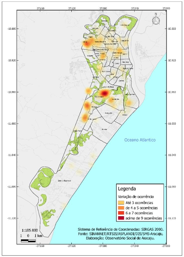 Na área da saúde, foi possível identificar, a partir de machas térmicas, o local de ocorrências de lesão infantil no município, de 2011 a 2019 (Mapa 3). Foi identificado que os maiores números de casos estavam concentrados na zona norte do município, correspondendo aos bairros do Olaria, Jardim Centenário, Bugio, Santos Dumont, Cidade Nova, Porto Dantas, Japãozinho, 18 do Forte, Santa Maria e 17 de março.