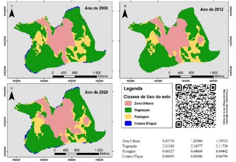 Por fim, foram analisadas informações acerca da evolução espaço-temporal de isso e ocupação do solo no bairro, a fim de identificar os impactos ambientais mais frequentes e as áreas mais afetadas. Para tanto, foram elaborados três mapas temáticos do bairro no período que compreende os anos de 2006, 2012 e 2020. Os mapas temáticos trabalhados possuem uma escala de 1:20.000 para o mapeamento da evolução no uso e ocupação da terra no bairro Teotônio Vilela nos últimos 15 anos, optou-se pelos resultados disponíveis do Projeto Mapeamento Anual da Cobertura e Uso do Solo do Brasil (MapBiomas, 2021).