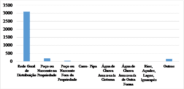 Os dados de infraestrutura urbana referente ao abastecimento de água nos domicílios do bairro (Gráfico 3) mostram que 88,5% (um total de 3.100 domicílios) possuem rede geral de distribuição de água potável, disponibilizada pela Empresa Baiana de Água e Saneamento S.A (Embasa). Enquanto que 4,2% (um total de 150 domicílios) são abastecidos por outras fontes, que podem incluir a utilização da água diretamente do rio, sem nenhum tratamento para o consumo humano e 7,3% (um total de 250 domicílios) abastecem suas residências com água de poços ou nascentes dentro e/ou fora de sua propriedade.