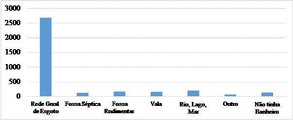 Referente ao esgotamento sanitário do bairro (Gráfico 4), constatamos que 86,6% (um total de 2.600 domicílios) possuem rede geral de esgoto. Enquanto que 5% (um total de 150 domicílios) possuem fossas rudimentar e/ou séptica. Além disso, 1,6% (um total de 50 domicílios) possuem valas e 3,3% (um total de 100 domicílios) despejam seus dejetos no rio, lago e mar. Uma porcentagem de 1,3% (um total de 40 domicílios) utilizam outras formas de descarte de seus rejeitos sanitários e 2,3 (um total de 70 domicílios) não possuem banheiros sanitários em suas residências.
