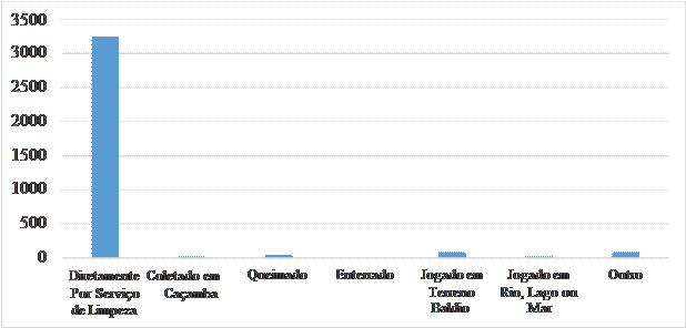 Os dados de infraestrutura urbana, referentes ao destino dos resíduos sólidos do bairro (Gráfico 5), mostram que 92,8% (um total de 3.250 domicílios) contam com coleta de lixo das suas residências. Enquanto, 1,4% (um total de 50 domicílios) não contam com esse serviço e por isso, queimam seus resíduos. No decurso desse levantamento constatamos que 2,8 (um total de 100 domicílios) descartam seus resíduos sólidos em terrenos baldios e 2,8 (um total de 100 domicílios) utilizam, inclusive uma parte da população sobrevivem da coleta material reciclável que é descartado.