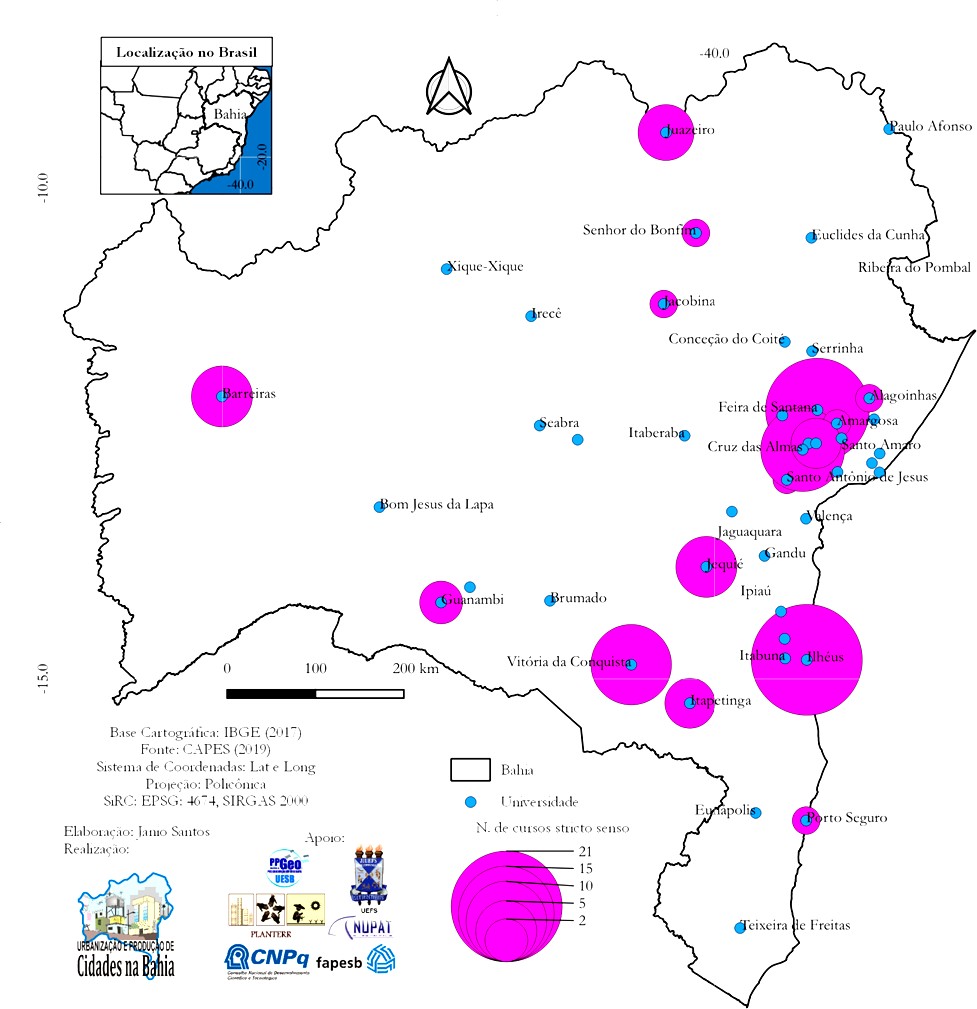 Na maioria dos casos vistos na Bahia, todavia, foi a “interiorização”5 do ensino superior, a desconcentração/descentralização de unidades públicas de saúde e a instalação de sedes administrativas estatais e federais que influenciaram a dinâmica das cidades sub-regionais, tais como Serrinha, Jacobina, Irecê, Santo Antônio de Jesus e Guanambi. Ainda que em proporção baixa, nota-se a presença de centros tecnológicos, de pesquisas e ciência e tecnologia, sempre derivados das universidades presentes, e isso cria a circulação de uma classe de letrados e intelectuais. Em muitos casos, inclusive, verificam-se cursos de pós-graduação stricto sensu, em universidades públicas e privadas, em níveis de mestrado e doutorado (ver mapa 4).