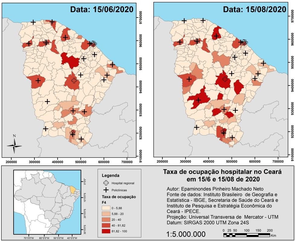 Para tanto, a espacialização de policlínicas e hospitais regionais permitem o acompanhamento da ocupação de leitos e da dimensão do desastre em diferentes áreas do Estado do Ceará, onde os municípios atendidos em cada região de planejamento do Estado dependem dessas unidades para serviços de maior urgência.