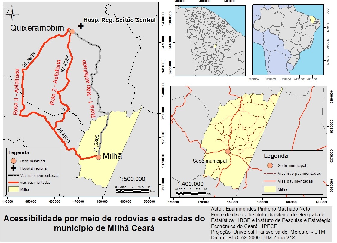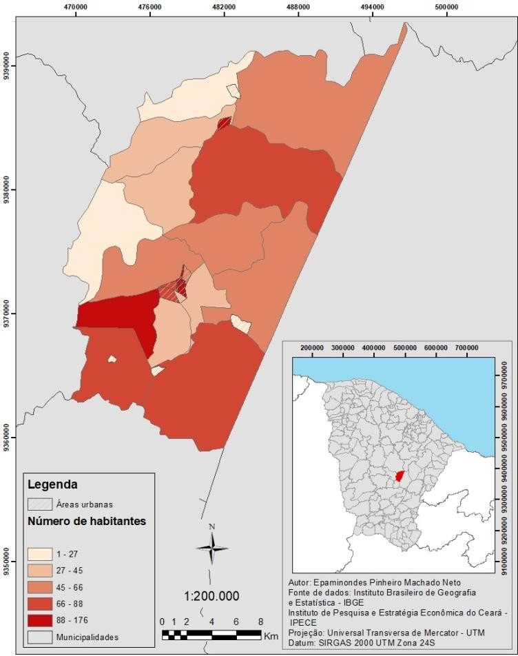 Por tanto, com auxílio de mapeamento do número de habitantes com mais de 50 anos ficou evidenciado que a maior parte dessa população vive em zona rural, demonstrando com reconhecimento da área que os acessos aos centros urbanos são realizados em estradas sem asfalto e que a média de distância dessas zonas da sede municipal é de 15 quilômetros, e o acesso a hospitais com Unidade de Terapia Intensiva - UTI é de em média 200 quilômetros para Quixeramobim e Iguatu no Estado do Ceará.